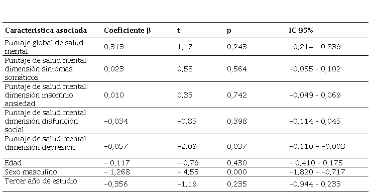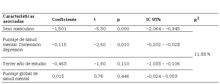 En la asociación de la salud mental, sus dimensiones y otras características sociodemográficas con el rendimiento académico en la Tabla 4, se pudo observar que, por cada punto que se incrementaba la depresión, el promedio de las notas (rendimiento académico) disminuía en -0,057 (IC=-0,11 - -0,003; p=0,037). Asimismo, el hecho de pertenecer al sexo masculino disminuía el promedio de las notas (rendimiento académico) disminuía en -1,268 (IC=-1,820 - -0,717; p=0,000). En el caso del resto de variables estas no se asociaron con una disminución del promedio de las notas de los estudiantes (Ver Tabla 4).