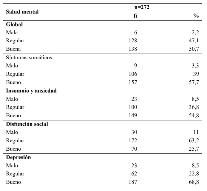 La salud mental global y sus dimensiones valoradas como bueno, regular y malo; más de la mitad 50,7 % tuvo una buena salud mental global; en la dimensión síntomas somáticos hubo una tendencia parecida con un 57,7 % que tuvo buena salud mental; en la dimensión insomnio y ansiedad la tendencia se mantuvo con un 54,8 % que tuvo buena salud mental; situación diferente se observó en la dimensión disfunción social donde hubo un predominio de la salud mental regular en más de la mitad de los participantes, equivalente en un 63,2 %; en la dimensión depresión se mantuvo la tendencia inicial en la que más de la mitad 68,8 % tuvo una buena salud mental (Ver Tabla 2).