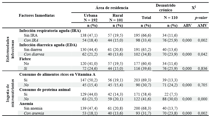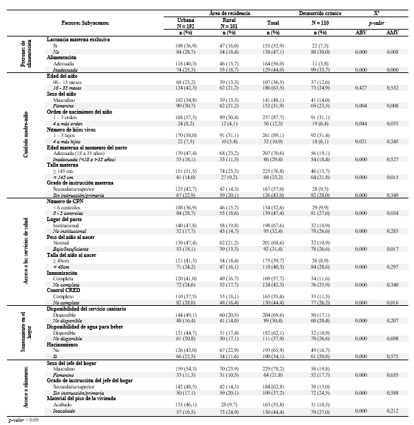 Abstract: This research aimed to determine the underlying and basic factors associated with chronic malnutrition in children from the northern highlands of Peru. The study was quantitative, explanatory and cross-sectional, developed with a sample of 293 children selected by stratified probability sampling, in rural (n=101) and urban (n=192) areas. Chronic malnutrition was determined by anthropometry and the use of Anthro v.3.2.2-WHO software, anemia by hemoglobin dosage, and the remaining variables were collected in a data sheet (child and mother module) and a home survey applied to mothers. The study was approved by the Ethics Committee of the Universidad Nacional de Cajamarca. Chronic malnutrition affected 37.5 % of the children. Underlying factors were present in more than 30 % of the children with chronic malnutrition, while basic factors were present in 45.7 %. On average, each category of interest affected 25 % of chronically malnourished children. All factors analyzed at the bivariate level were associated with chronic malnutrition, except for the child's age (p=0.427); meanwhile, the multivariate analysis showed a considerable reduction in association, with only 9 of 29 categories associated with chronic malnutrition. There was a significant association at the bivariate level, but it decreases at the multivariate level. The factors associated with chronic undernutrition are linked to the country's social inequalities, where the poor populations