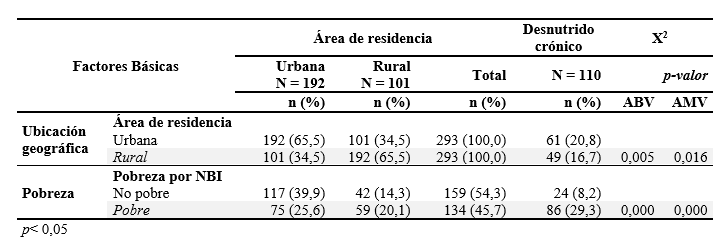 La pobreza por necesidades básicas insatisfechas (NBI) afectó al 45,7 % de los hogares, donde 29,3 % de los niños con DC tenían al menos una NBI. Los factores básicos a nivel bivariante y multivariante evidenciaron asociación significativa (p=<0,05) a la DCI (tabla 4).