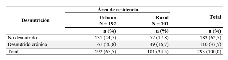 El 37.5 % de los niños presentaron DC, siendo esta más incidente en la zona urbana (44,7 %) comparada con la rural (17,8 %) (tabla 1).