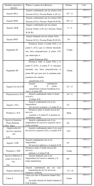 Tabla 1: Medidas angulares y líneas del análisis cefalométrico de Steiner
