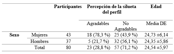 Las 80 radiografías cefálicas laterales del cráneo que cumplieron con los criterios de selección fueron analizadas, el 50 % correspondían al sexo femenino y 50 % al masculino. Solo en el 28,7 % (n=23) del total de participantes se determinó una silueta estéticamente aceptable (puntaje mayor a 30), del cual el 78,3 % (n=18) fueron hombres y el 21,7 % (n=5) fueron mujeres (Tabla 2).