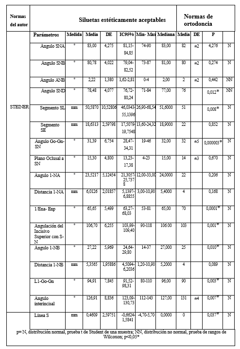 Después de comparar las medidas cefalométricas de los tejidos duros y blandos del grupo de las siluetas con percepción estéticamente aceptables con las normas de referencia del análisis de Steiner, se estableció que existe significancia estadística en ocho medidas: en el ángulo SND (p=0,012), segmento SL (p=0,008), ángulo Go-Gn-SN (p=0,000003), 1/Ena- Enp (p=0,0001), Angulación del Incisivo Superior con S-N (p=0,001), Ángulo 1- NB (p=0,010), L1-Go-Gn (p=0,003), ángulo interincisal (p=0,007) y Línea S (p=0,037), demostrando diferencias entre la media de la norma cefalométrica de Steiner con la media de este grupo de estudio. (Tabla 3)