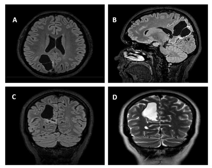 Al momento del ingreso, la paciente acudió conducida por el personal de emergencia, en estado postictal, presentando previamente tres episodios convulsivos. El examen físico neurológico se encontraba dentro de parámetros normales, es decir, pupilas isocoricas - normo reactivas con diámetro de 2 mm, reflejo consensual fotomotor presentes, sin signos de focalidad neurológica, con tendencia a la somnolencia; los signos vitales se encontraban en PA 106/65 mmHg, FC 88 lpm, FR 18 rpm, SatO2 94%; dentro de los exámenes paraclínicos que se realizaron: la biometría hemática realizada evidenciaba leucocitosis 15.37 10³/μL con neutrofilia de 75.5% (explicada por el proceso inflamatorio que desencadena un evento como las crisis convulsivas), Glucosa 85.25 mg/dl; fue realizada una resonancia magnética nuclear (RMN) en donde se evidenció una lesión de hipointensa a nivel de lóbulo tempo occipital derecho, de características quísticas, y con contenido líquido, categorizado como quiste porencefálico.