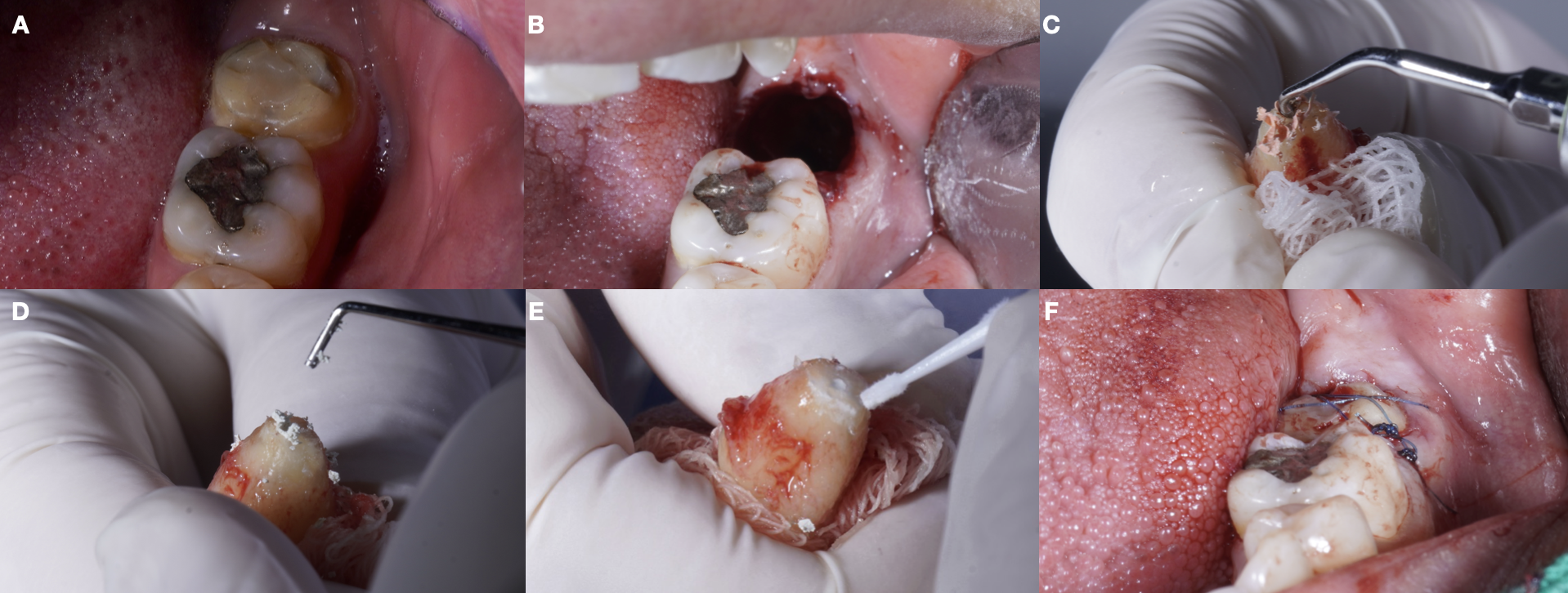 Figure 1. – A. Intraoral photograph – B. Alveolus after atraumatic extraction – C. Retropreparation with ultrasonic tip – D. Retrofilling with bioceramic material – E. Cleaning of excess retrofilling material – F. Reimplantation and fixation with X-suture.