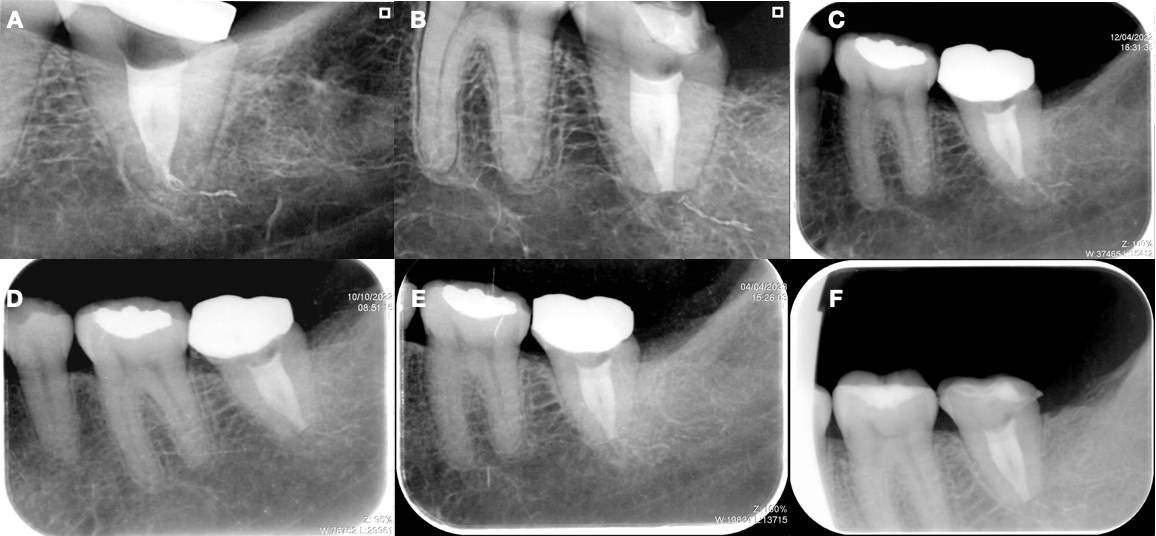 Figure 2. – A. Initial periapical radiograph – B. Immediate periapical radiograph after reimplantation control – C. Periapical radiograph after one month after reimplantation control – D. Periapical radiograph after six months after reimplantation control – E. Periapical radiograph after one year after reimplantation control – F. Periapical radiograph after two years after reimplantation control.