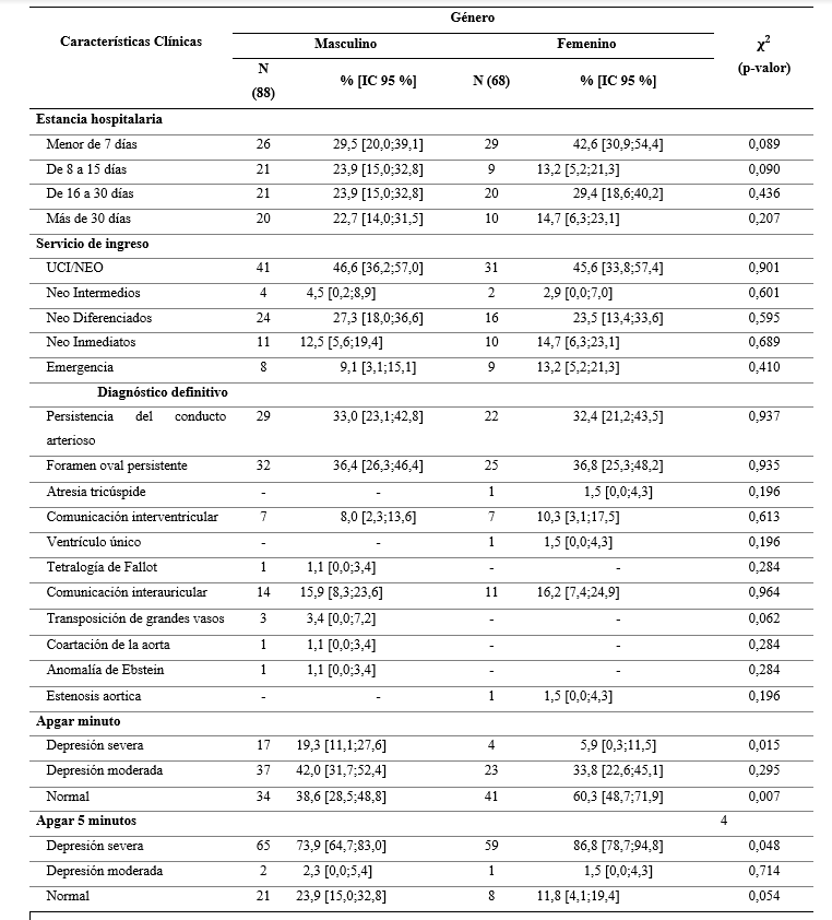 Entre las características clínicas del niño, se encontró que el 69,5 % de varones tiene una estancia hospitalaria mayor a 7 días en mujeres 56,4 % el 46,6 % de varones son derivados al servicio de UCI/NEO en mujeres el 45,6 %, además el 27,3 % de varones se derivaron al servicio de NEO diferenciados en mujeres un 23,5 %. De acuerdo con el diagnóstico definitivo el 36,4 % de varones tienen foramen oval persistente en mujeres 36,8 % de mujeres; el 33,0 % de varones persistencia del conducto arterioso en féminas un 36,8 % de mujeres; el 15,9 % de varones comunicación interauricular en mujeres16,2 % de mujeres. Asimismo, el 42,0 % de varones reporta Apgar al minuto con depresión moderada de mujeres el 60,3 % de mujeres; el 73,9 % de varones evidenció Apgar a los 5 minutos con depresión severa en mujeres 86,8 % de mujeres. De la relación estadística entre características clínicas de pronóstico negativo y género se identifica que existe relación en depresión severa al minuto (p=0,015) y depresión severa a los cinco minutos (p=0,048) (Tabla 3).