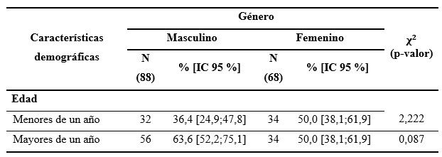Las características demográficas de los niños indican que la mayoría de los varones son mayores de un año (63,6 %); en tanto las frecuencias de las mujeres son igual para ambos grupos (menores y mayores de un año) (50,0 %). Además, se observa que no existe relación significativa entre las características demográficas y el género (Tabla 1).