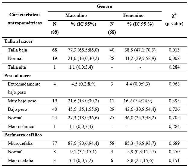 Al analizar las características antropométricas de los niños al momento de nacer se evidenció que el 77,3 % de varones presentan talla baja y las mujeres con un 58,8 %, en varones el 71,6 % tienen un peso inferior a 2500 gramos (bajo peso, muy bajo peso y extremadamente bajo peso) en mujeres el 63,2 % de mujeres; mientras que el 87,5% de varones mostró microcefalia y las mujeres el 85,3 % de mujeres. Además, existe relación estadística entre género y talla baja al nacer (p=0,013) (Tabla 2).