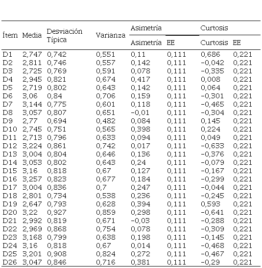 Los ítems explicados con medidas de tendencia central y dispersión, que los ítems con mayor promedio (X=>2) están dentro de los ítems 1 al 26. Además, las medidas de asimetría y curtosis entre los rangos de +/- 1,5 lo cual caracteriza distribuciones normales en todos los ítems (Tabla 1).