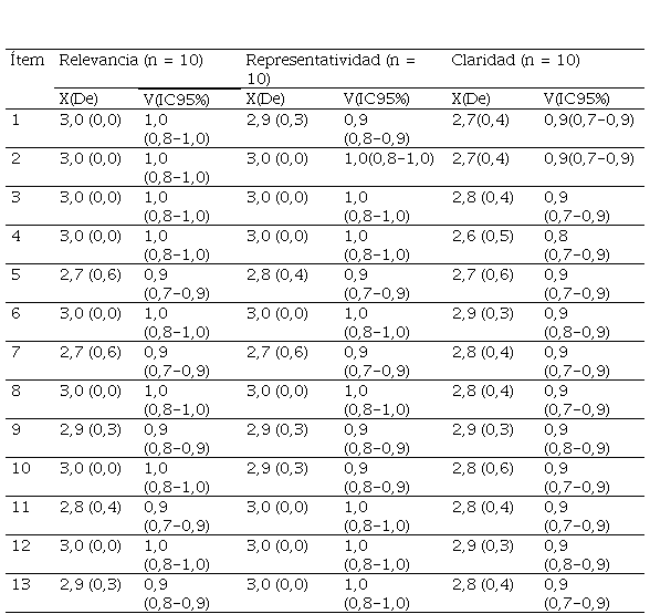 Los índices de validez de contenido por ítems extraídos por el coeficiente V de Aiken bajo la clasificación de relevancia, representatividad y claridad realizado por 10 jueces expertos, donde no se encontró deficiencia en ninguna clasificación, por ende, todos los ítems alcanzaron los intervalos del 95% de confianza entre los rangos mínimos = 0,7 y máximo =1,0 (Tabla 2).