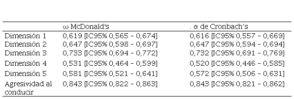 Los índices de consistencia interna de la “Escala de agresividad al conducir en transportistas del servicio urbano” usando los métodos de Omega de McDonal y alfa de Cronbach. En general la escala tiene una consistencia interna esperada de ω = 0,843 [IC95 % 0,822 – 0,863] y α = 0,843 [IC95 % 0,821 – 0,862] y la escala es considerada buena. La dimensión 1 alcanza ω = 0,619 [IC95 % 0,565 – 0,674] y α = 0,616 [IC95 % 0,557 – 0,669]; así también, la dimensión 2 se obtiene ω = 0,647 [IC95 % 0,598 – 0,697] y α = 0,647 [IC95 % 0,594 – 0,694]; además la dimensión 3 tiene ω = 0,733 [IC95 % 0,694 – 0,772] y α = 0,732 [IC95 % 0,691 – 0,769]; en la dimensión 4 tiene un ω = 0,531 [IC95 % 0,464 – 0,599] y α = 0,520 [IC95 % 0,446 – 0,585]; finalmente en la dimensión 5 se obtuvo ω = 0,581 [IC95 % 0,521 – 0,641] y α = 0,572 [IC95 % 0,506 – 0,631] (Tabla 4).