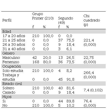 En cuanto al perfil de los estudiantes de enfermería; en el primer grupo, el 100 % de los estudiantes se encontraban en el rango de 17 a 20 años. En el segundo grupo el 75,5 % se mantenía dentro de ese rango, mientras que surgieron otros grupos etarios: el 18,4 % de 21 a 25 años y 6,1 % de 26 a 30 años. La prueba de chi-cuadrado muestra un valor de x² = 221,4 con un p < 0,01, lo que indica un cambio significativo en la edad en los diferentes grupos de formación.