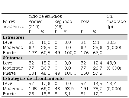 Según las puntuaciones, se clasificó la dimensión "estresores" en niveles: Leve (0-25), moderado (26-50) y fuerte (51-75). La dimensión "síntomas", se clasificó en niveles: Leve (0-25), moderado (26-50) y fuerte (51-75). Finalmente, en la dimensión de "estrategias de afrontamiento", se consideraron niveles de leve (0-28), moderado (29-75) y fuerte (58-85). Luego, para evaluar el estrés académico, se sumaron estas tres dimensiones, categorizándolo como leve (0-78), moderado (79-157) y fuerte (158-235). (24)
