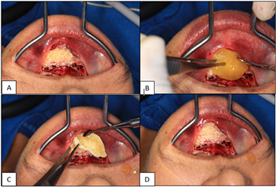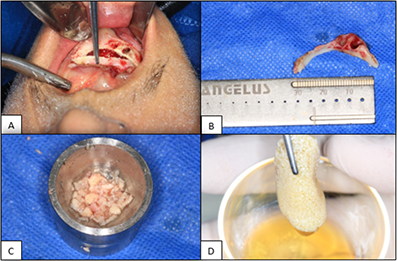 A - Extraction of the bone fragment. B - The bone fragment is measured, considering that it is a type I Bone, obtained from the parasymphysis and symphysis. C - We crush the bone fragment in a trephine and immerse it in a saline solution to maintain hydration. D - PRF (Platelet Rich Fibrin) and HiperRF (Bone Growth Factor) are mixed with synthetic Bone, thus creating the compound known as Sticky Bone. In this clinical case, in addition to the synthetic graft, autologous Bone is added to ensure that the graft is not only osteoconductive and osteoinductive but also osteoforming, fulfilling the three biological characteristics of a graft. The main objective is to promote the formation of more Bone. (Figure 4)