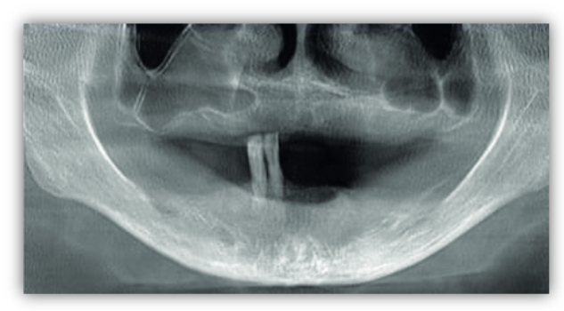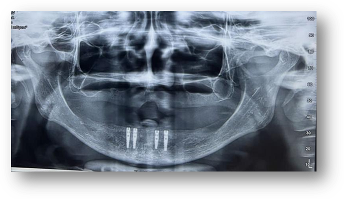 The initial panoramic radiograph revealed a maxilla with marked vertical atrophy, suggesting significant bone height loss in this region. Likewise, the mandible shows evident horizontal atrophy, indicating a considerable reduction in the width of the mandibular Bone. The radiographic image also clearly shows two remaining teeth: a lower right central incisor and a lower right lateral incisor, both located in the anterior part of the mandible. (Figure 1)