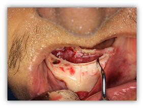 In quadrant three, the horizontal bone crest does not exceed 2.7 mm. To place a dental implant, at least 1.5 mm of Bone is required on each side. (8) Therefore, the implant cannot be placed since the thinnest implant available has a diameter of 2.9 mm. Thus, the objective is to regularize the ridge under the crest until reaching a diameter buccal-lingual 3 mm. (Figure 2)
