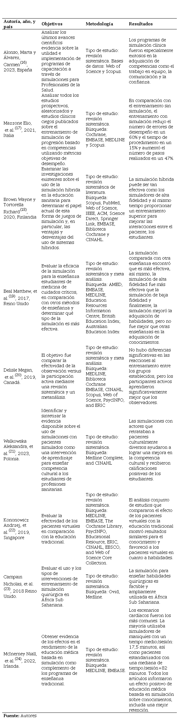 La estrategia de búsqueda fue: ("simulation training"[MeSH Terms] OR ("simulation"[All Fields] AND "training"[All Fields]) OR "simulation training"[All Fields]) AND ("education, medical"[MeSH Terms] OR ("education"[All Fields] AND "medical"[All Fields]) OR "medical education"[All Fields] OR ("medical"[All Fields] AND "education"[All Fields]))