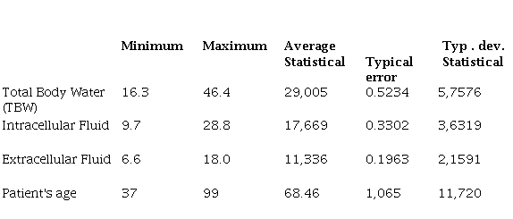 Descriptive analysis of the sample, consisting of 121 patients, revealed considerable variability in TBW measurements and age. TBW levels ranged from 16.3 to 46.4 liters, with a mean of 29.005 liters and a standard deviation of 5.7576, reflecting considerable dispersion in TBW levels. ICF values ranged from 9.7 to 28.8 liters, with a mean of 17.669 liters and a standard deviation of 3.6319, indicating significant variation in this compartment. ECF ranged from 6.6 to 18.0 liters, with a mean of 11.336 liters (Table 2).
