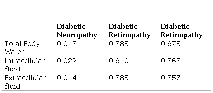 In diabetic retinopathy, the significance levels were 0.883, 0.910, and 0.885 for TBW, ICF, or ECF; therefore, no significant differences were found in levels between patients with and without this complication, respectively. Since all values were greater than 0.05, the null hypotheses were retained, suggesting that body water is not significantly related to the presence of diabetic retinopathy in this population (Table 3).