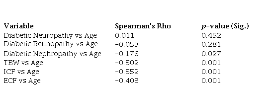 Spearman's correlation test showed a significant negative association between age and TBW compartments, indicating that as patients age, TBW (Rho = -0.502, p < 0.001), ICF (Rho = -0.552, p < 0.001), and ECF (Rho = -0.403, p < 0.001) volumes decrease. Regarding microvascular complications, only diabetic nephropathy showed a weak negative correlation with age (Rho = -0.176, p = 0.027), suggesting a lower prevalence in older patients, while neuropathy and retinopathy did not show significant associations. Demonstrating a relationship between aging and reduced body water, which could influence the management of type 2 diabetes (Table 4).