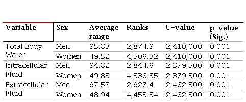 In the Mann-Whitney U test, significant differences were found in the distribution of TBW, ICF and ECF between men and women. Men presented larger volumes in these compartments, with higher average ranges compared to women. In the TBW, men had an average range of 95.83 and women 49.52 (U = 2,410,000, p = 0.001); in the ICF, the values were 94.82 in men and 49.85 in women (U = 2,379,500, p = 0.001); and in the ECF, men reached an average range of 97.58, while women 48.94 (U = 2,462,500, p = 0.001). These results indicate that men have higher volumes of water in all compartments evaluated compared to women, suggesting a significant difference in the distribution of total body water according to sex in the population studied (Table 5).
