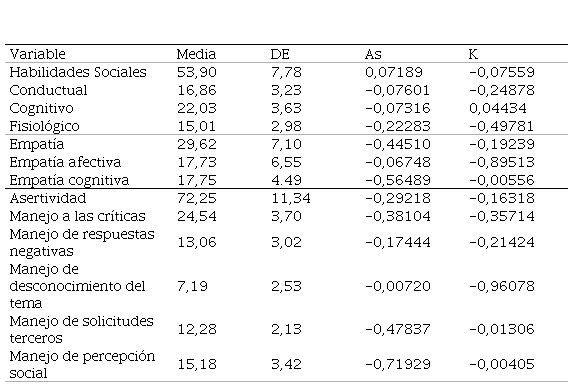 Además, se observa que las dimensiones de las habilidades sociales, como la dimensión conductual, cognitiva y fisiológica, así como la empatía y sus respectivas dimensiones, han mostrado asimetrías negativas. Esto sugiere que la población tiende a obtener puntajes superiores a la media en estas áreas. Por otro lado, las habilidades sociales muestran una asimetría positiva, lo que indica que los sujetos encuestados tienden a presentar puntajes por debajo de la media en este aspecto.
