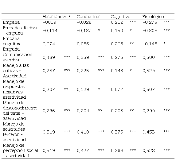 El análisis correlacional paramétrico por R Pearson indica que habilidades sociales solo muestra relación significativa con asertividad (r=0,469) y el resto de sus dimensiones, correlaciones que se caracterizan por ser positivas, y de intensidades que oscilan entre lo moderado a bajo; es decir las puntuaciones elevadas de habilidades sociales se relacionan con puntuaciones elevadas de asertividad, así como sus dimensiones. Otros hallazgos han demostrado que las habilidades sociales no muestran relación significativa con empatía, lo que deja inferir que, sin importar la empatía del sujeto, se puede desarrollar habilidades sociales. En cuanto a las dimensiones como habilidades sociales conductuales, se encontraron relaciones moderadas a bajas pero significativas y positivas con asertividad y sus dimensiones, sin embargo, la empatía afectiva (factor de empatía) muestra relación significativa al 95 % pero inversa o negativa, lo que sugiere que tener empatía afectiva se asocia con una disminución de habilidades sociales en su dimensión conductual. La dimensión cognitiva de habilidades sociales muestra relaciones bajas, positivas y significativas con empatía, asertividad y sus dimensiones, excepto con la dimensión manejo de respuestas negativas. Por su parte, la dimensión fisiológica de habilidades sociales, evidencia relación positiva, moderada a baja con asertividad y sus dimensiones, sin embargo, muestra correlaciones inversas con empatía junto a sus dimensiones, en otras palabras, las personas que puntuaron alto en habilidades sociales fisiológicas han demostrado tener menor nivel de empatía tanto afectiva como cognitiva.