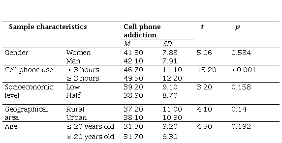 Table 2 analyzes cell phone dependence and the characteristics of the sample, showing that cell phone use is the only factor with a significant difference. Participants who use their cell phone three or more hours a day show greater dependence (M = 49.5, SD = 12.2) compared to those who use it less than 3 hours (M = 46.7, SD = 11.1), with p < 0.001. In contrast, no significant differences were observed in cell phone dependence based on gender, socioeconomic level, geographic area, or age, suggesting that these factors do not determine cell phone dependence in this sample.