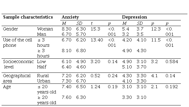 Table 3 shows that gender and cell phone use are significant factors in anxiety and depression levels. Women and people who use their cell phones for three or more hours a day have higher levels of anxiety and depression. On the other hand, no significant differences in anxiety and depression levels are observed concerning socioeconomic status, geographic area, or age, indicating that these factors do not have a noticeable impact on this specific sample.