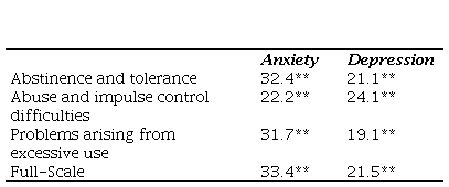Table 4 shows a correlation between the variables, indicating that withdrawal and tolerance factors, as well as problems stemming from excessive cell phone use, are associated with internalizing problems such as anxiety and depression, with a p-value below 0.05. However, abuse and impulse control difficulties were not associated with these internalizing problems.