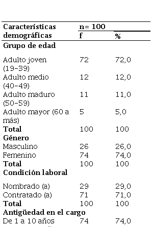 En la descripción de las características de los profesionales de Enfermería se identificó que presentaba una distribución demográfica y laboral específica. En términos de edad, el grupo predominante es el de adultos jóvenes (19-39 años) que representa el 72 % de la población, seguido por adultos medios (40-49 años) con un 12 %, adultos maduros (50-59 años) con un 11 %, y adultos mayores (60 años o más) con un 5 %. En cuanto al género, existe una predominancia femenina significativa, con el 74 % de mujeres frente al 26 % de hombres. En relación con las características laborales, la mayoría de los participantes son empleados contratados (71 %), mientras que el 29 % empleados titulares.