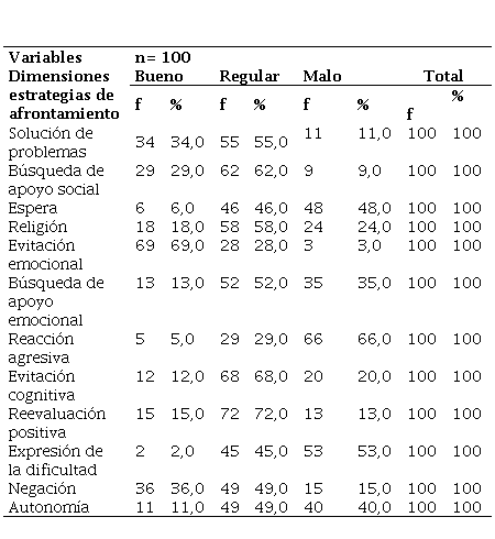 En cuanto a la valoración general de las estrategias de afrontamiento, solo el 7 % de los participantes emplean estrategias consideradas como "buenas", mientras que el 83 % utiliza estrategias clasificadas como "regulares". Este hallazgo refleja que la mayoría de las personas no recurre a métodos óptimos para enfrentar sus problemas, lo cual podría estar relacionado con una falta de habilidades adecuadas para afrontar situaciones adversas. Además, un 10 % de los participantes emplea estrategias clasificadas como "malas" (ver tabla 2).
