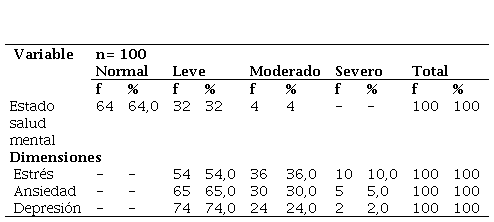 Los datos revelan en cuanto al estado de salud mental que el 64 % de los participantes reporta un estado de salud mental normal, mientras que un 32 % se encuentra en un estado leve (regular) y 4 % presenta una salud mental moderado (mala).