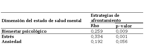 Los resultados del análisis de correlación entre las dimensiones de afrontamiento y el estado de salud mental revelan una relación positiva significativa. El coeficiente de correlación de Spearman (ρ) obtenido es de 0,259, lo que indica una asociación directa: a medida que se implementan dimensiones de afrontamiento más efectivas, se evidencia una mejora en el estado de salud mental de los individuos.