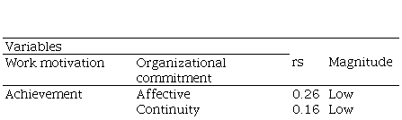 Table 2 shows a low direct relationship (0.10 ≤ rs <0.30) between the need for achievement and the affective ( rs =0.26), normative ( rs =0.26), and continuity ( rs =0.16) components of employee commitment.