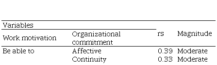 Table 3 reveals a direct correlation of moderate dimension (0.30 ≤ rs <0.50) between the need for being able to with the affective (rs =0.39), continuity ( rs =0.33), and normative (rs =0.30) components of commitment in workers.