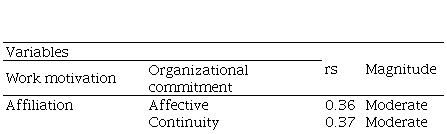 In Table 4, a direct relationship of moderate intensity (0.30 ≤ rs <0.50) is observed between the need for affiliation with the affective (rs =0.33), continuity (rs =0.37), and normative (rs =0.31) components of commitment in workers.