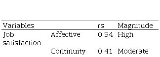 Table 5 shows a high direct correlation (0.50 ≤ rs <1.0) between job satisfaction and the affective component (rs =0.54) and a moderate one (0.30 ≤ rs <0.50) with the continuity (rs =0.41) and normative ( rs =0.37) factors of commitment.