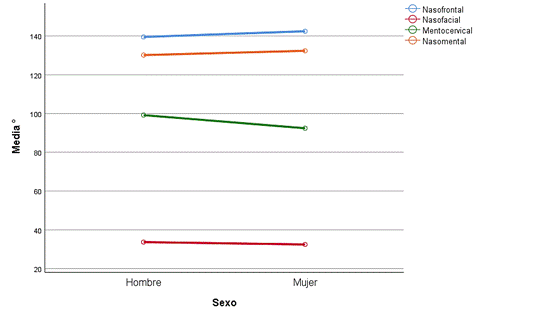 La relación de los promedios de los ángulos cefalométricos de acuerdo al sexo, mostró que los ángulos nasofrontal y nasomental fueron mayores en las mujeres y el ángulo nasofacial y mentocervical fueron mayores para los hombres (Figura 3).