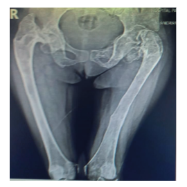 Figure 2. Hip and AP radiograph of bilateral femur: an inveterate fracture is evident at the level of the left femoral neck in addition to bilateral coxa vara.