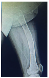 Figure 3. Lateral radiograph of the left femur: poor bone quality, very thin cortices, ground-glass images, areas of osteolysis and osteosclerosis in the greater and lesser trochanters and the neck of the femur, loss of distinction between the cortex and the bone marrow of the upper part of the femur.