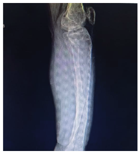 Figure 4. Lateral radiograph of the left knee and leg: evidence of valgus deformity