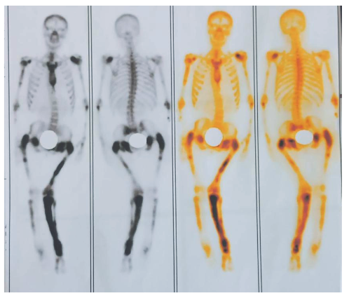 Figure 6. Bone scan: marked increase in osteoblastic activity with bone deformity in the humerus, femur, tibia, which appears to correspond to the scintigraphic pattern of Paget's disease as a first consideration.