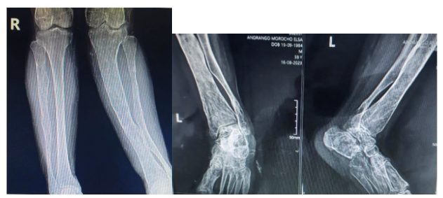 Figure 5. 5a AP radiograph of bilateral legs, 5b Anteroposterior and lateral radiograph of left ankle: tibia and fibula with increased bone density, bone with irregular and thin cortices, valgus deformity of tibia and fibula are observed.
