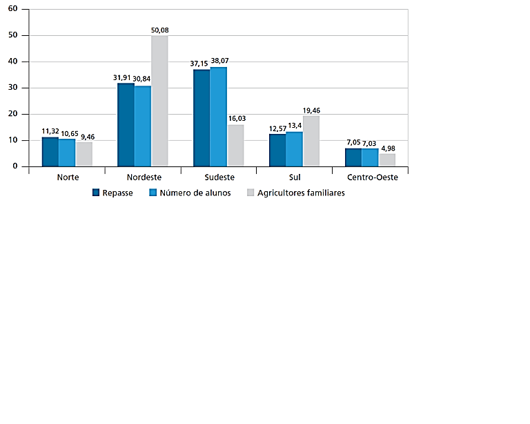 Percebe-se, portanto, que a região Nordeste é a que tem o maior percentual de agricultores familiares do Brasil (50,08% dos estabelecimentos familiares) e recebe cerca de 30% do total dos recursos, um pouco menos que a região Sudeste que recebe 37% dos recursos do PNAE. Vale ressaltar que a maioria dos agricultores familiares do Nordeste ainda não se modernizou e possui uma insuficiente e deficiente estrutura de produção, além de uma frágil e recente organização coletiva, o que dificulta o acesso às políticas públicas e sua ampliação na agricultura familiar, inclusive ao PNAE.