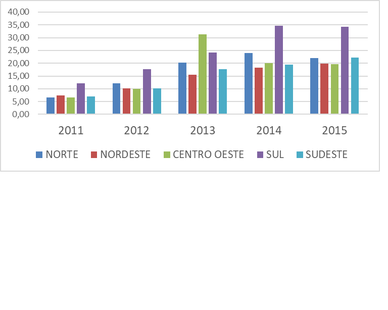 O Gráfico 2 mostra o desempenho por região e enfatiza que na região do Sul do Brasil, na qual os agricultores familiares possuem uma maior e mais eficiente estrutura de produção, além de uma organização coletiva mais desenvolvida, incluindo níveis de adesão a cooperativas, redes etc. mais altos do que os de outras regiões. Nota-se que as entidades executoras tiveram um desempenho excelente já desde o primeiro ano de vigência da nova legislação. A região Nordeste, embora tenha uma agricultura ainda desestruturada e pouca organização coletiva, ampliou a aquisição de produtos da agricultura familiar.