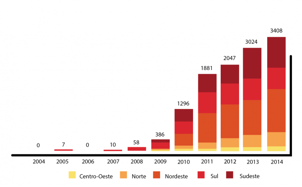 Como se observa na Tabela 2, no ano de 2014 os recursos aumentaram, bem como a parcela destes destinada para a agricultura familiar. Apesar desse aumento, apenas a região Sul conseguiu atingir os 30% recomendados pela Lei nº 11.947/2009. Além disso, percebe-se que, mesmo não atingindo o percentual dos 30%, a região Nordeste teve um crescente aumento na participação, pois dos 1.633 municípios que recebem o recurso, 1.170 compraram da agricultura familiar mais de 70%. Esse aumento mostra que, apesar da seca dos últimos anos na região Nordeste, os agricultores familiares criaram cooperativas, produziram e participaram desse mercado institucional que tem se mostrado garantido para a comercialização direta dos seus produtos.