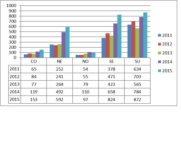 Quando se trata do segmento da agricultura familiar, apesar de a região não estar atingindo o mínimo exigido, o PNAE se apresenta como um importante instrumento para garantir o escoamento da produção, e uma abertura significativa da visão dos agricultores familiares para um nicho de mercado cuja dimensão era até então desconhecida. E tem sido na esteira das políticas públicas com foco na demanda, a exemplo do PNAE e do PAA, que na região Nordeste vem surgindo um número cada vez maior de organizações coletivas, especialmente cooperativas, conforme mostra o Gráfico 4.